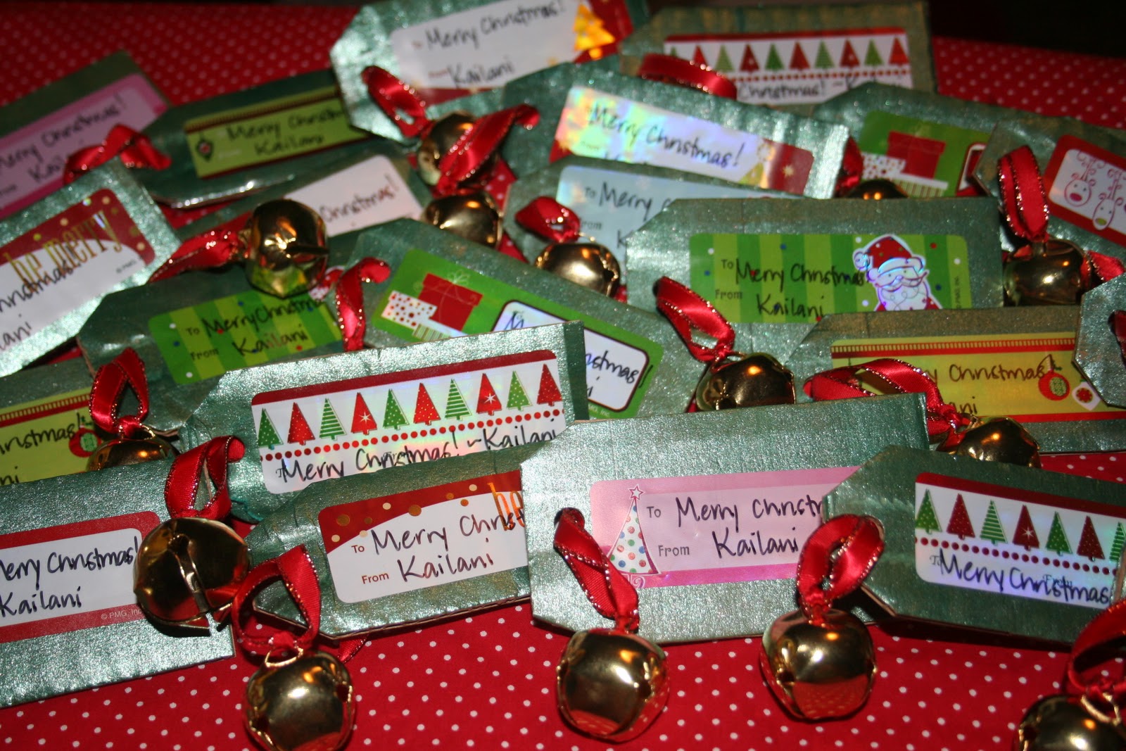 Now for the classmates. We were going to make reindeer dust again this year but opted for something different. Instead we bought a bunch of bells and ribbon and made each of her classmates a bell necklace. I reused some cardboard and painted it and cut it out to look like gift tags: